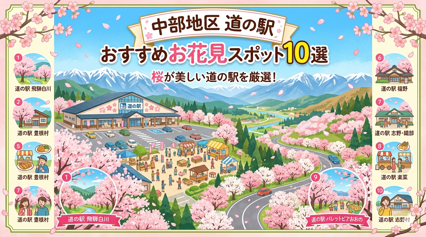 中部エリアの桜名所は、平地の早咲きから山間部の遅咲きまで幅広く、長い期間楽しめるのが魅力です。だからこそ、休憩・食事・買い物・情報収集がまとめてできる道の駅を起点にして回ると、春ドライブがぐっと組みやすくなります。名所クラスの桜を見に行きながら、地元グルメや特産品も楽しめるのが、道の駅旅のいちばんの魅力です。